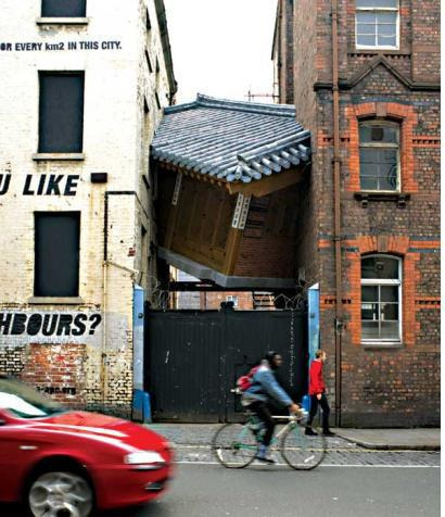 설치작가로 유명한 서도호의 작품 <연결하는 집(Bridging Home)>을 보자.10) 이 장면은 얼핏 서양문화에 포위, 잠식되어 이도 저도 못할 지경에 이른 한국문화, 혼란스러운 한국의 정체성을 상징하는 것으로 보인다. (당연히 서도호는 이질적 문화충돌에 따른 자기정체성의 혼란을 작업의 중심 주제로 다룬다.) 그러나 한편으로는, ‘전통문화’를 표방했으나 ‘먹방’으로 히트행진을 하고 있는 한옥마을의 모습을, 역설적이게도 재생 가능한 ‘지금, 여기’의 삶, 근대의 자취를 짓이기며 환원 불가능한 중세의 ‘역사’를 소환시켜내기에 급급한 전주의 모습을 떠올리게 한다.