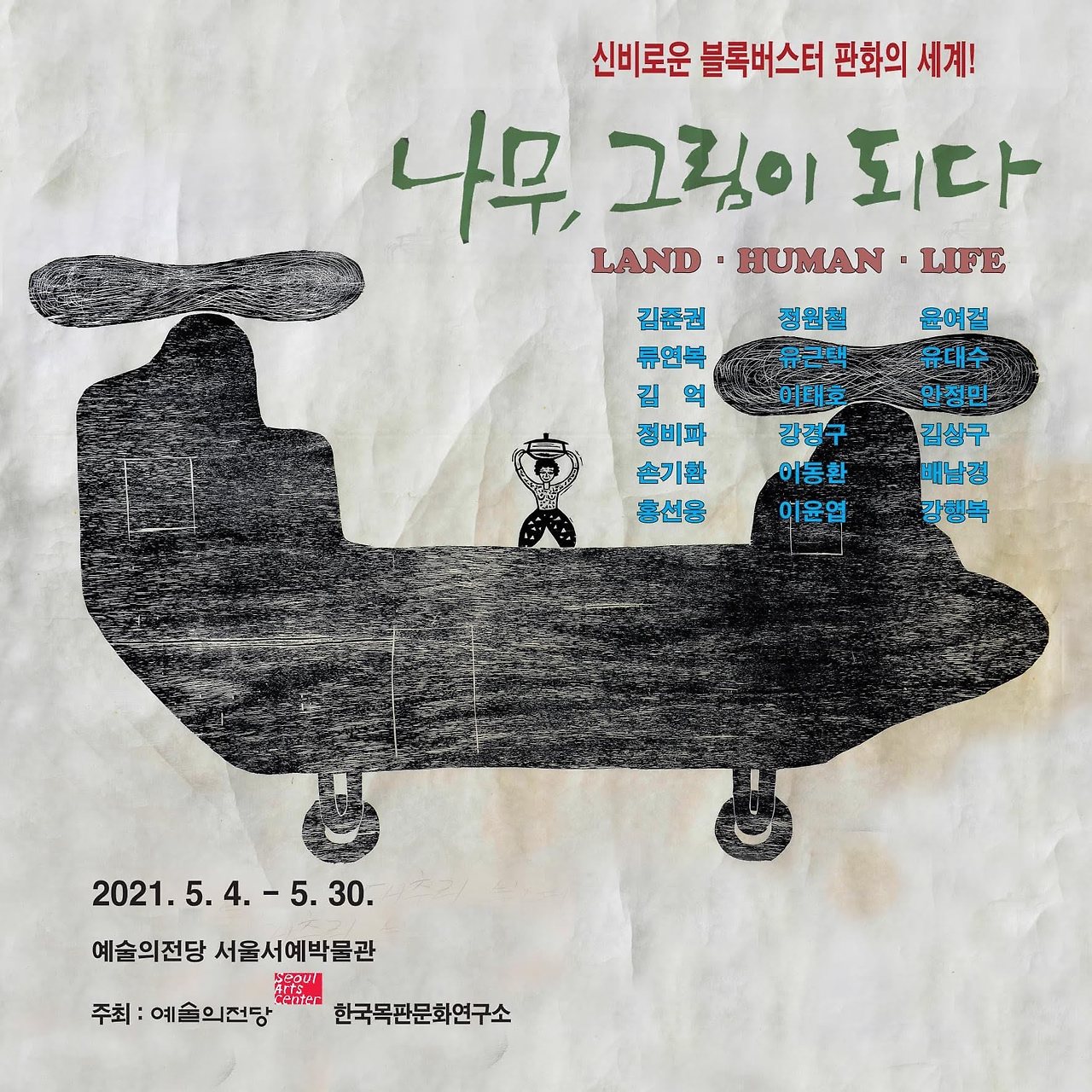 우리가 지금까지 보지 못했던 새로운 대형 목판화의 세계가 눈앞에 펼쳐진다.예술의전당(사장 유인택)과 한국목판문화연구소는 '신비로운 블록버스터 판화의 세계 -나무, 그림이 되다 : LAND·HUMA