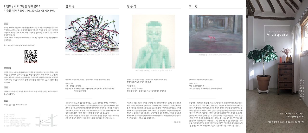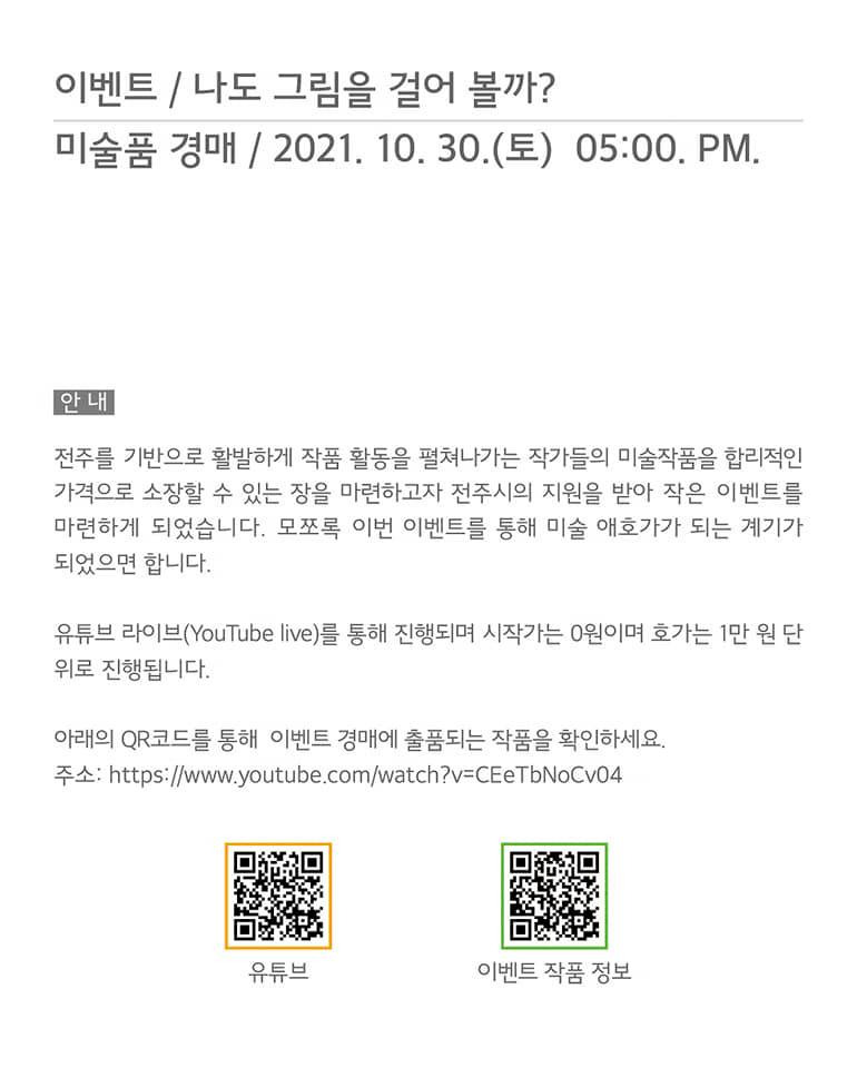 1. 이번 전시는 2021년 전주시의 유휴공간 활성화 프로젝트의 일환으로 전주 구시가지의 빈 점포를 활용하여 진행되며 코로나 시기와 맞물려 온라인으로 진행된다. 프로그램으로는 온라인 전시와 이벤트로 경매가 진행된다.