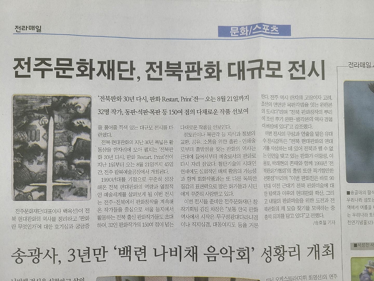 한편 전시기간 중에는 매주 토ㆍ일요일, 오리지널 목판화를 찍어보는 ‘예술체험-나도 판화가’가 운영되며, 전북판화의 현재와 미래를 진단하는 ‘작가와의 대화’도 열릴 예정이다.